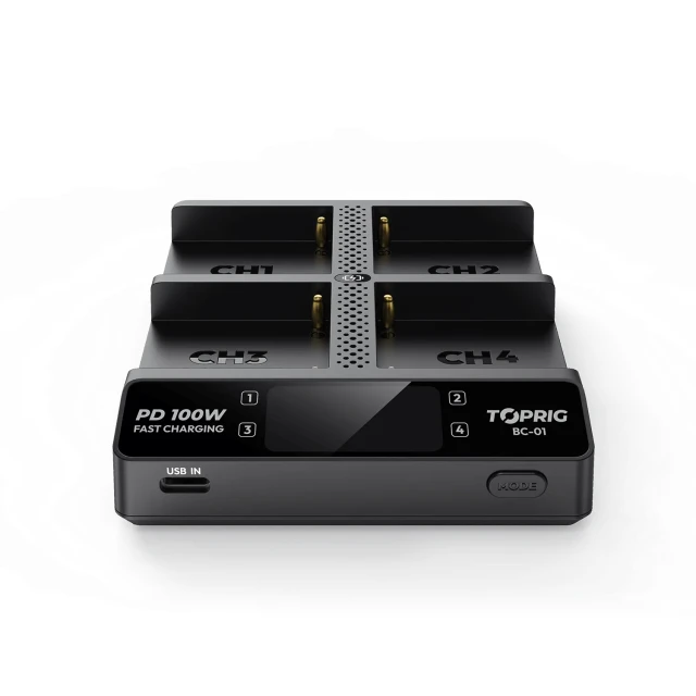 Accsoon TopRig 100W 4-Bay NP-F hitri polnilnik je kompakten, visoko zmogljiv polnilnik s pametno tehnologijo polnjenja, barvnim LCD-zaslonom in USB-C PD vhodom, zasnovan za hitro in varno polnjenje baterij Sony NP-F serije.