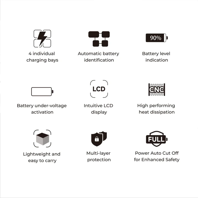 Polnilnik je opremljen s štirimi neodvisnimi polnilnimi mesti in ima pametni način polnjenja, ki samodejno zazna vrsto baterije in ustrezno prilagodi izhodni tok, tako da vsako baterijo polni posamično za optimalno učinkovitost in dolgo življenjsko dobo. Podpira tudi aktiviranje baterije pri prenizki napetosti, kar omogoča varno oživitev globoko razrejenih baterij.