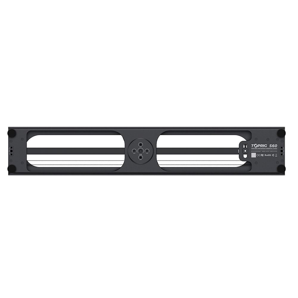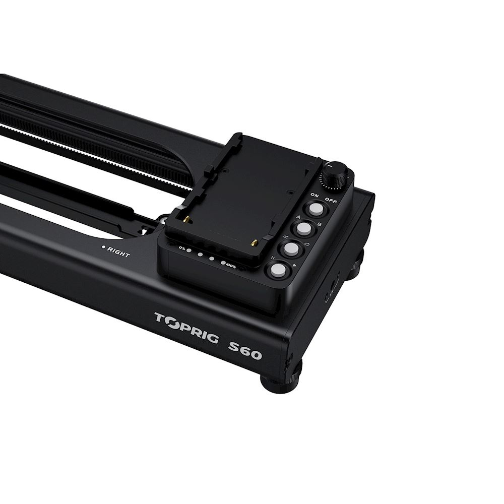TOPRIG S60 ima mehanizem za mehak zagon/zaustavitev v obliki črke S za gladko pospeševanje in zaviranje, kar zagotavlja stabilne posnetke vsakič. Napredna zasnova napenjanja vodilnega kolesa podpira gibanje pod različnimi koti in raznolike vzorce snemanja. Možnosti napajanja vključujejo baterije NP-F ali DC vhod, z izjemno nizko porabo energije, ki omogoča do 60 ur vodoravnega delovanja z eno samo baterijo NP-F550. Z vgrajenimi nadzornimi ploščami, podporo za aplikacije in kompaktno prenosljivostjo je TOPRIG S60 zmogljiva rešitev za nadzor gibanja za zahtevna produkcijska okolja.