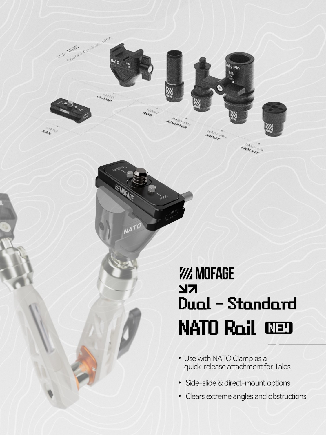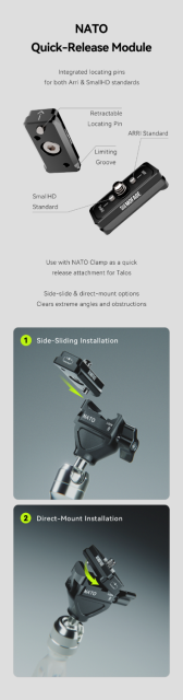 Dvojni standard (Arri & SmallHD) NATO vodilo je zasnovano tako, da je namestitev bolj vsestranska in priročna. To poveča možnosti vaše celotne namestitve.