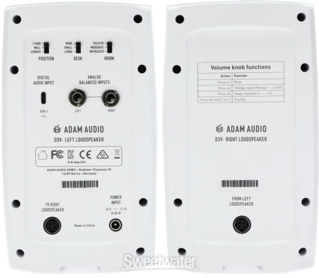 D3V je opremljen z vhodom USB-C in dvema uravnoteženima vtičnicama TRS, zato ponuja visokokakovostne digitalne in analogne povezave. Racionalizirani upravljalni elementi vključujejo večfunkcijski gumb za glasnost, intuitivna stikala za kompenzacijo prostora in večbarvni indikator stanja. D3V je opremljen s snemljivimi stojali za monitorje ter vgrajenimi navojnimi točkami za pritrditev na stojala za mikrofone (3/8″) za popolno pozicioniranje v vsakem okolju.