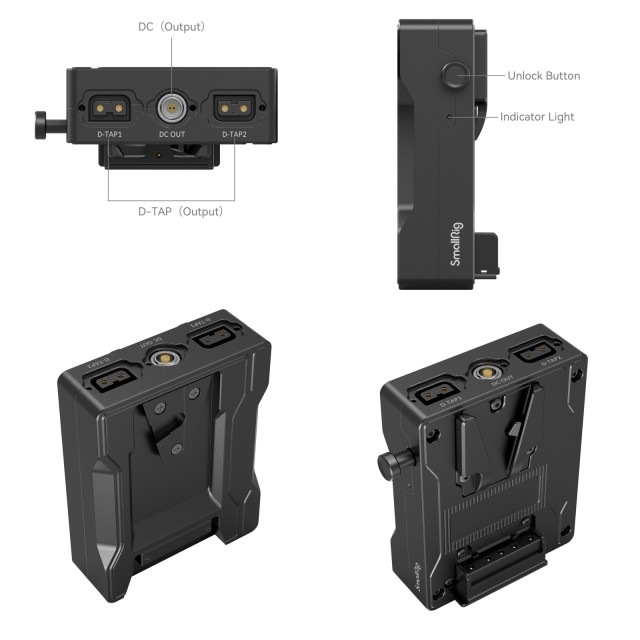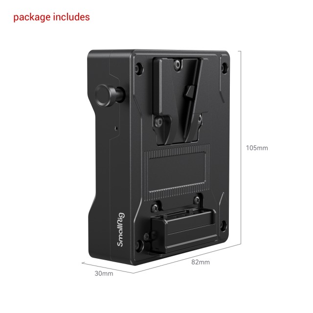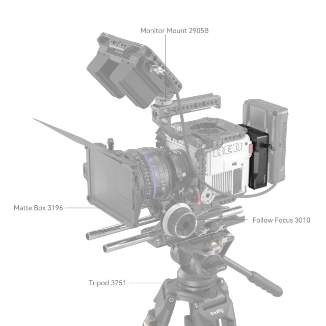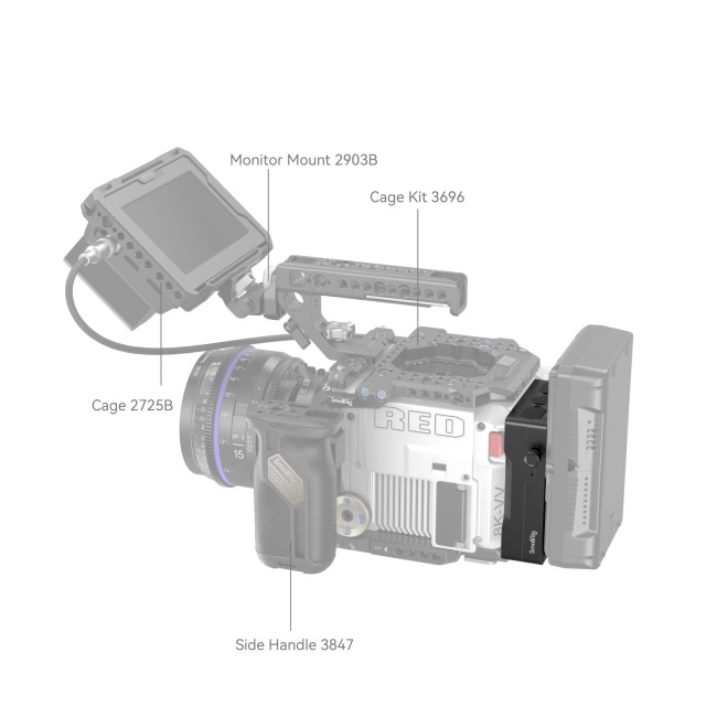 Adapter za baterijsko ploščo SmallRig V-Mount za RED V-RAPTOR 3898 je namenjen priključitvi velike baterije V-Mount na fotoaparat RED V-RAPTOR in po potrebi napajanju drugih naprav. Pred priključitvijo baterije V-Mount jo preprosto pritrdite neposredno na zadnjo stran naprave RED V-RAPTOR; baterija začne delovati, ko se prižge kontrolna lučka. Pritisnite gumb za sprostitev na levi strani in hitro odstranite baterijo. Plošča ima tudi dva priključka D in en izhodni priključek DC za napajanje monitorjev, sistemov za prenos videa itd.