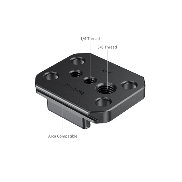 Adapter SmallRig za Arca Quick Release Plate Buckles za kamere GoPro APU2668 omogoča enostavno namestitev GoPro sponk na Arca združljive glave stativa. Sponko preprosto potisnite na stran v zgornji del adapterja, dokler se ne zaskoči. Adapter ima na spodnji strani standardno ploščico Arca, ki omogoča namestitev kamere GoPro na katero koli platformo Acra. Opremljen je tudi z luknjami z navojem 1/4"-20 in 3/8"-16 ter luknjami za montažne vijake. Celoten adapter je izdelan iz trdnega eloksiranega aluminija, zasnovan pa je tako, da je kompakten in lahek.