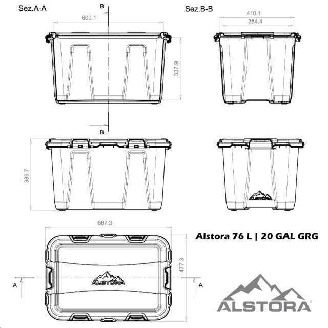 Zabojniki Alstora se lahko zlagajo drug na drugega in varčujejo s prostorom: ko so prazni, se lahko zlagajo drug v drugega, ko so polni, pa jih je mogoče zlagati za urejeno in funkcionalno skladiščenje. Vgrajene reže v pokrovu in dnu so namenjene pritrdilnim trakovom, ključavnicam in/ali pečatom.