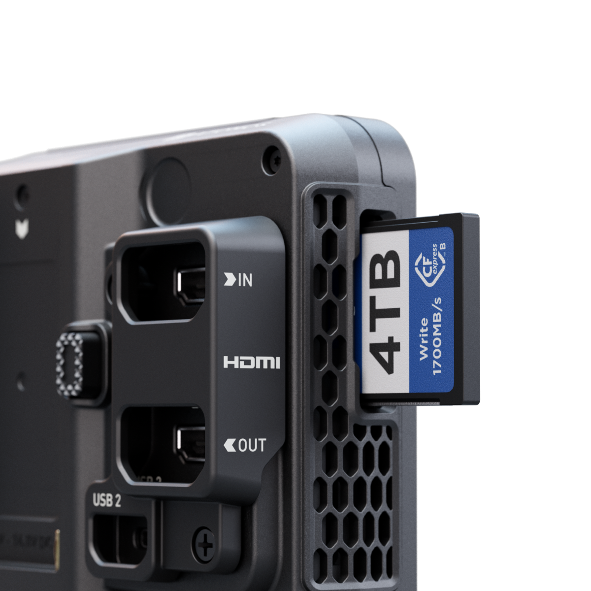 Posnetki se lahko shranijo na medij CFexpress Type B ali zunanji USB-C pomnilnik (npr. SSD). Podpira kodeke ProRes RAW / RAW HQ, ProRes 422 HQ, ProRes 422 in ProRes LT ter je združljiv z vodilnimi sistemi NLE.