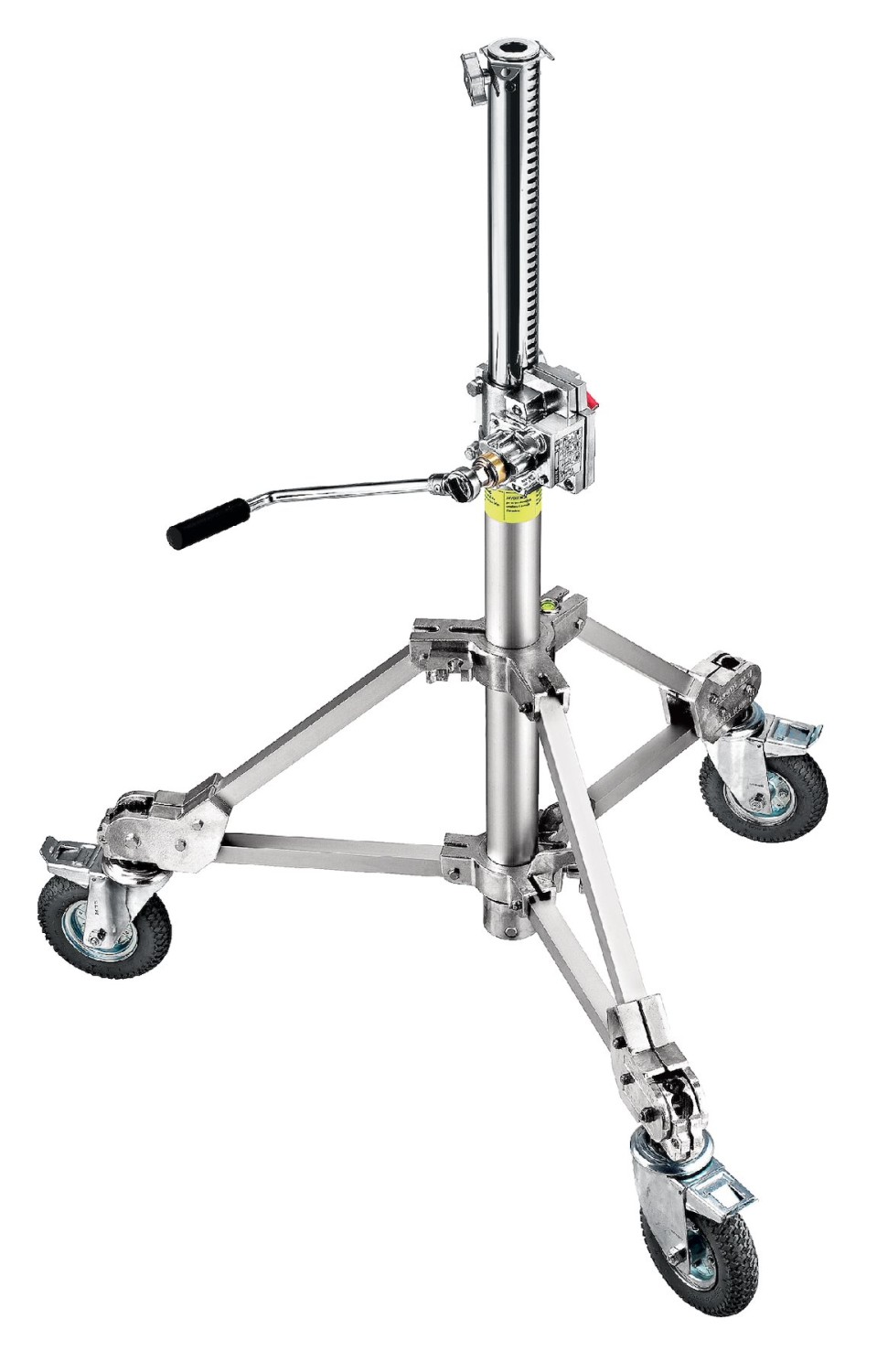 Opremljen z večsmernimi kolesi, napolnjenimi s peno in zavorami, omogoča B7018 enostavno premikanje po različnih površinah, hkrati pa ohranja natančen nadzor nad pozicioniranjem. Stojalo ima robusten zobniški sistem z odstranljivim ročajem z zobato kljuko za gladko dvigovanje in spuščanje težkih bremen. Ko se ne uporablja, se ročaj z zobato kljuko lahko priročno shrani na strani zgornjega ulitka, pritrjenega na spodnji steber. Zložljiva dolžina 126 cm in širok premer podstavka 120 cm zagotavljata prenosljivost in stabilnost.