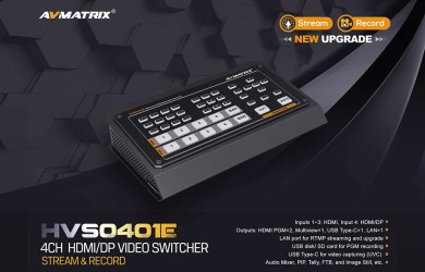 Preklopite do en vhod DisplayPort in štiri vhode HDMI, medtem ko gledate programski kanal s štirikanalnim video preklopnikom HDMI in DP Micro podjetja AVMATRIX. To kompaktno stikalo ponuja pretakanje RTMP prek vrat LAN, podpira video vhod in izhod do 1080p60 z vgrajenim zvokom ter ponuja mešanje zvoka z dvema analognima stereo vhodoma in izhodoma za mikrofon/linijo 3,5 mm ter vgrajenim zvokom. Možnosti upravljanja stikala vključujejo gumbe, T-bar in upravljanje IP prek vrat LAN.
