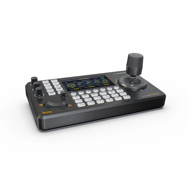 AVMatrix PKC3500-NDI je izboljšana različica priljubljenega krmilnika PKC3500, ki je posebej zasnovan za delovne tokove PTZ, osredotočene na NDI. Njegov svetel 5-palčni zaslon na dotik zdaj dekodira in prikazuje do štiri NDI-tokove v realnem času, kar vam omogoča resnično vizualno povratno informacijo brez potrebe po zunanjem monitorju. Natančni 4D joystick, T-bar in tipke zagotavljajo gladko upravljanje pan/tilt/zoom/focus, medtem ko polno NDI odkrivanje in upravljanje dopolnjujejo tradicionalni protokoli VISCA, VISCA-over-IP, Pelco-P/D in ONVIF.