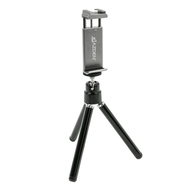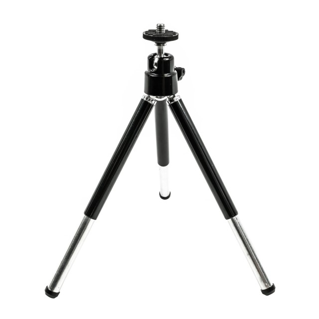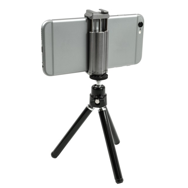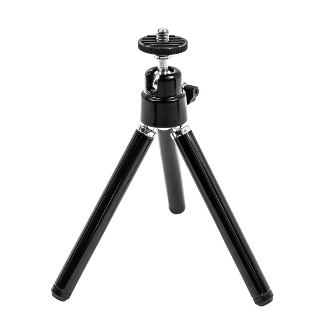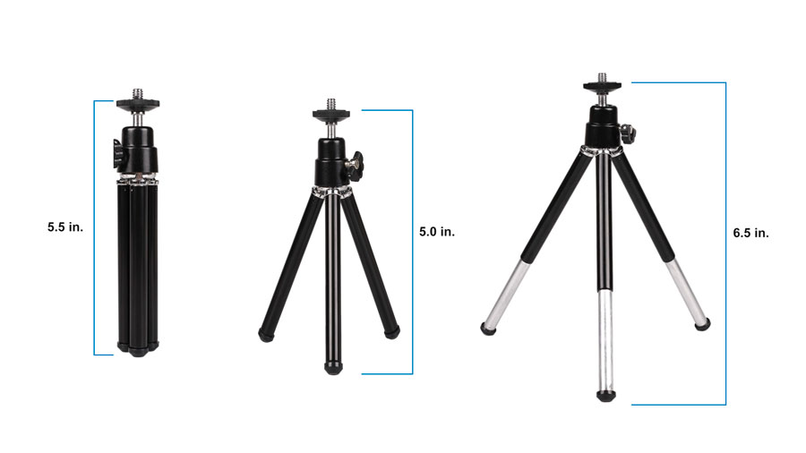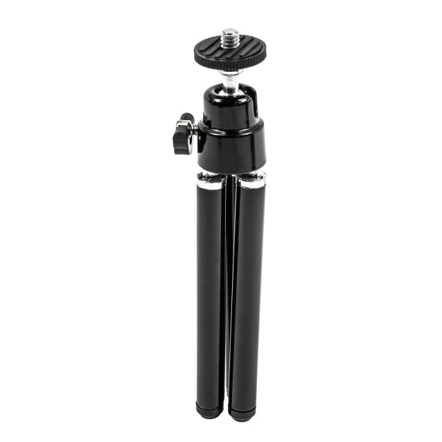 Stojalo za stativTa lahek miniaturni stativ se dobro obnese kot namizno stojalo za vaš pametni telefon ali pa se z zložitvijo nog pretvori v držalo za snemanje videoposnetkov na poti. Raztegljive noge omogočajo nastavitev višine stativa od 5,0 do 6,5 palca. Kroglična gibljiva glava omogoča nastavitev idealnega nagiba in kota. Z nagibno stranjo je mogoč 90-stopinjski nagib za portretno orientacijo, glavo pa lahko zategnete z vijakom s križnim nastavkom. Zaradi univerzalnega navoja ¼"-20 lahko stativ uporabljate tudi z drugimi majhnimi fotoaparati.