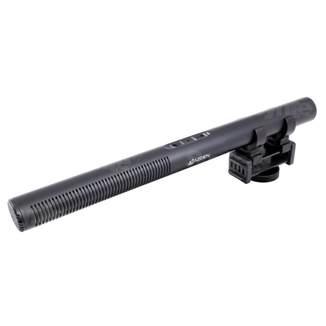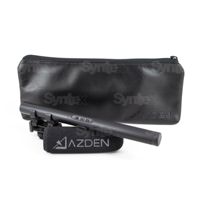 Oddajni mikrofonAzden SGM-250 z dvojnim napajalnikom in izhodom XLR. Vključuje nosilec za udarce, penasti pokrov in kovček z zadrgo.