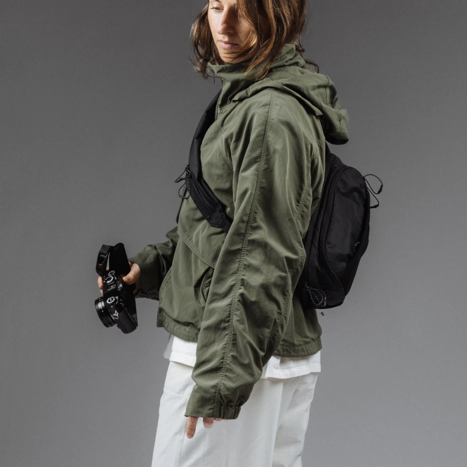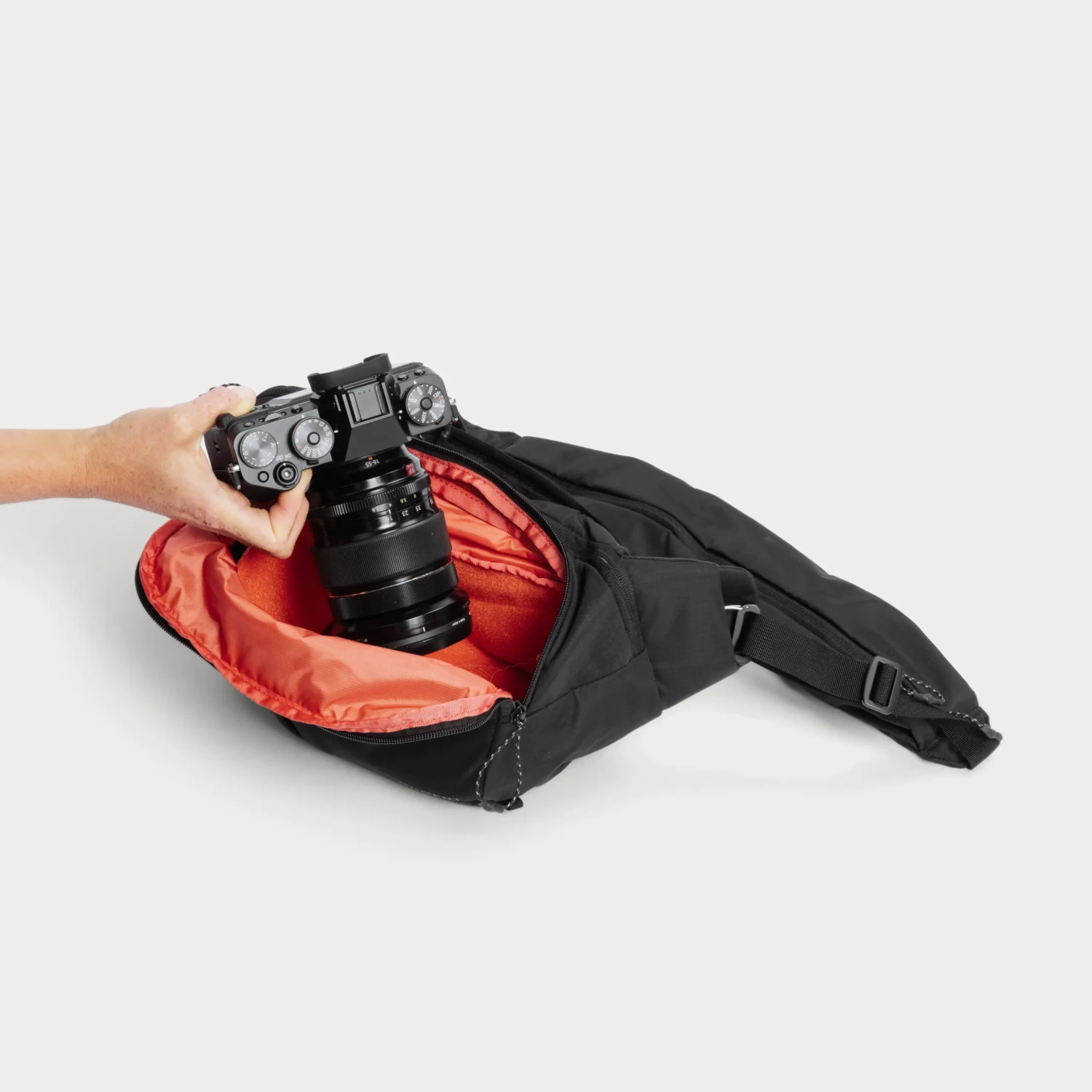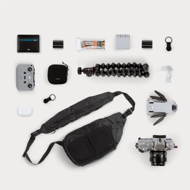 Značilni žep z zadrgo na rami spremeni glavni trak torbe v funkcionalen sistem oblazinjenih žepov, ki vam omogoča takojšen dostop do nujnih stvari, kot so telefon, filtri, denarnica ali AirPods. Torba je dovolj prostorna za polnoformatno kamero s teleobjektivom in tablico, hkrati pa dovolj majhna, da lahko sledite ostalim članom ekipe.