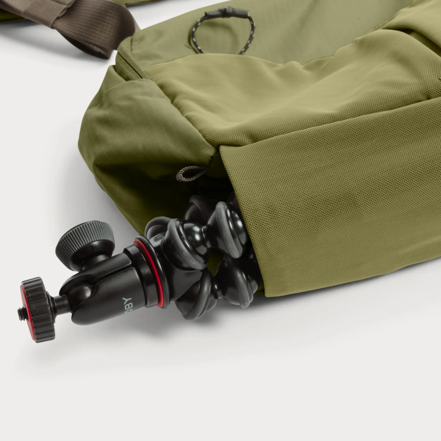 Značilni žep z zadrgo na rami spremeni glavni trak torbe v funkcionalen sistem oblazinjenih žepov, ki vam omogoča takojšen dostop do nujnih stvari, kot so telefon, filtri, denarnica ali AirPods. Torba je dovolj prostorna za polnoformatno kamero s teleobjektivom in tablico, hkrati pa dovolj majhna, da lahko sledite ostalim članom ekipe.