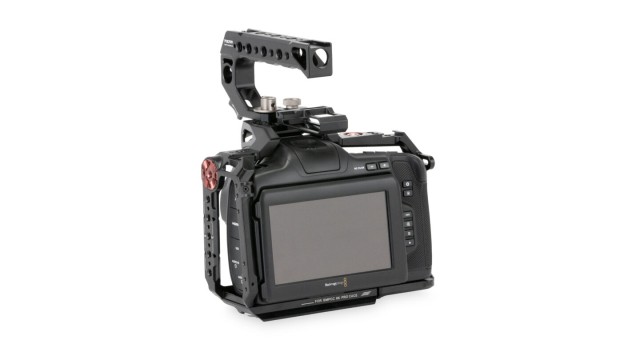 Pri uporabi polovične kletke se lahko spodnja plošča podaljša, da podpira baterijsko držalo Black Magic Design. Priloženo 15-milimetrsko držalo za palice je mogoče namestiti za podporo 15-milimetrskim palicam pred ohišjem fotoaparata, kadar uporabljate baterijsko držalo v nastavitvi Half Cage. Priloženi zgornji ročaj za hitro sprostitev je mogoče pritrditi na zgornji del kletke s sprejemnikom za hladno čeveljnico in vijakom ¼"-20. To zagotavlja izjemno varno povezavo za udobno upravljanje in upravljanje sistema fotoaparata. Vrhnji ročaj ima dodatne navoje ¼"-20, sprejemnike za hladno čevelj in vodoravno 15-milimetrsko držalo za palico za namestitev zunanjih monitorjev ali EVF. Nosilec pogona SSD se pritrdi neposredno na kletko z vijakom 1/4″-20 in namestitvenim zatičem.
