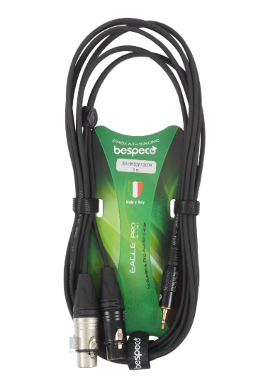 Bespeco EAYMS2FX300R je povezovalni kabel XLR(F) na 3,5 mm TRS (3 m, črn) z vodniki iz bakra brez kisika (OFC), polprevodniško notranjo ovojnico iz PVC za prenos brez šuma, 92-odstotno spiralno zaščito, pozlačenimi konektorji iz aluminija z modernizirano varovalko na XLR(F) in trpežno ovojnico iz PVC/vulkaniziranega silikona, ki zagotavlja zanesljivost visokokakovostnega zvoka v profesionalnih nastavitvah.