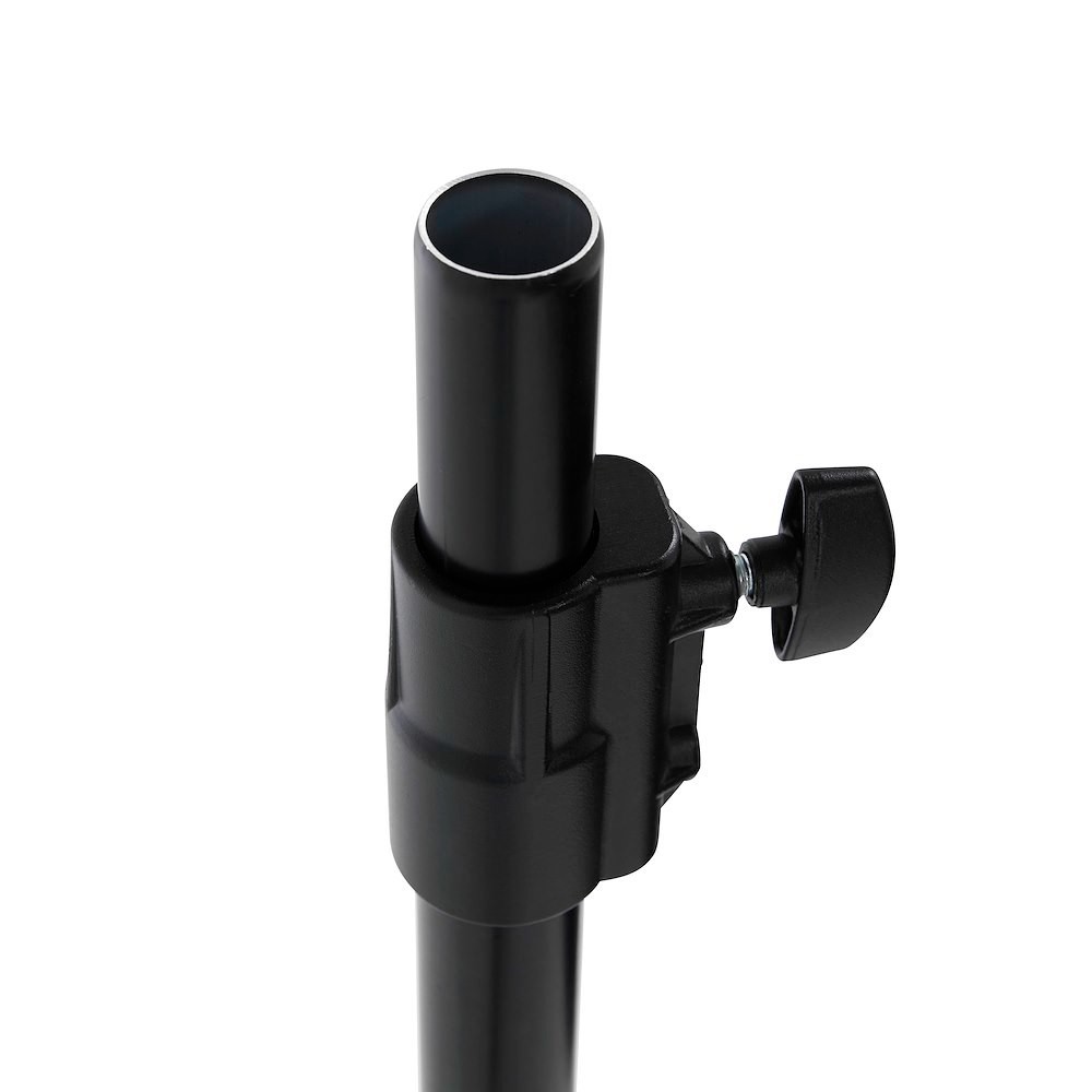 Manfrotto 126BMUAC združuje varnost z zračno blazino in pametno izravnavanje v črnem eloksiranem aluminijastem okvirju. Dva dela (40/35 mm) se z varovalom za prste gladko raztegneta do 218 cm, medtem ko dvojno ojačene okrogle noge (Ø22 mm) in široka podlaga zagotavljajo ničelno upogibanje pri obremenitvi do 30 kg (10 kg pri popolni raztegnitvi). 35 mm moški nastavek sprejema velike pritrdilne elemente ali adapterje za zvočnike, ena izravnalna noga pa se prilagaja ±15° za naklone. S 106 cm v zloženem stanju je idealno ravnovesje med višino, trdnostjo in prenosljivostjo za HMI, LED-panele ali PA-zvočnike v filmski industriji, na dogodkih ali v fotografiji – zračna blazinica ščiti opremo in prste med spuščanjem.