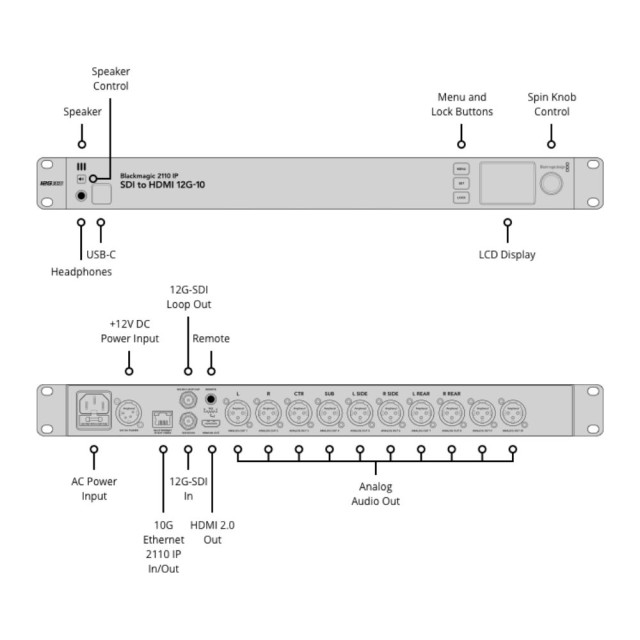 Blackmagic 2110 IP SDI na HDMI 12G-10 vključuje deset kanalov analognega zvočnega izhoda XLR za spremljanje prostorskega zvoka, ki omogoča daljinski nadzor glasnosti in nastavljivo zakasnitev, kar je idealno za usklajevanje z zvokom na televizorjih in projektorjih. Vključuje spremenljivo ojačenje in zakasnitev za popolno AV sinhronizacijo ter 3D LUT za natančno barvno kalibracijo zaslonov HDMI. Enota ima sprednji zaslon LCD s predogledom videoposnetka, stopnjami zvoka in meniji ter izhodom za zvočnike in slušalke.