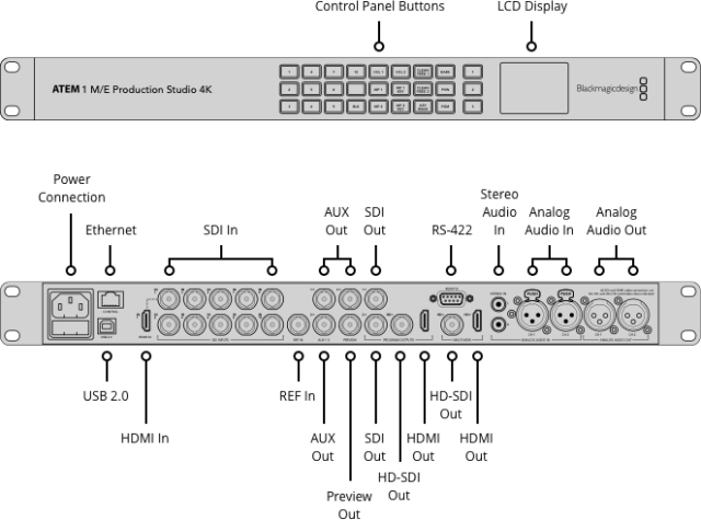 Programska nadzorna ploščaStikalu ATEM 1 M/E Production Studio 4K je priložena tudi programska nadzorna plošča za operacijska sistema Windows in Mac OS X, ki omogoča popoln nadzor funkcij naprave s standardnega prenosnega računalnika ali delovne postaje. Če imajo uporabniki raje strojne nadzorne plošče, lahko dodatno kupijo ATEM 1 M/E Broadcast Panel ali ATEM 2 M/E Broadcast Panel.