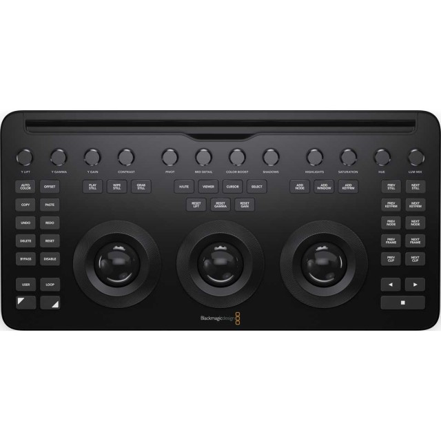 Poleg tega ima barvna plošča DaVinci Resolve Micro Color Panel na levi, zgornji in desni strani plošče vrsto gumbov za nadzor transporta in gradacije, ki najpomembnejše in najpogosteje uporabljene ukaze postavljajo na dosegu roke, tako da lahko stranka dela hitreje. Številni od teh kontrolnih elementov, kot so brisanje, kurzor in izbira, so bili doslej na voljo le na veliko večjih ploščah za gradacijo Mini ali Advanced.