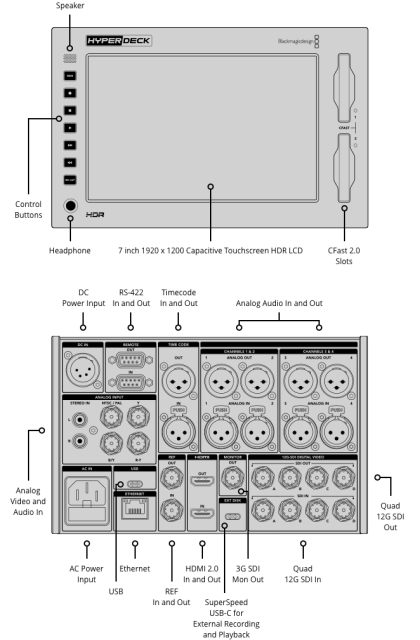 HyperDeck Extreme ima zaslon na dotik za upravljanje vseh funkcij in predogled snemanja. Po namestitvi nadzornega modula HyperDeck Extreme ga je mogoče upravljati tudi s tradicionalnimi gumbi za transport in kolescem Jog/Shuttle, obe napravi pa je mogoče z izbirnim okvirjem namestiti v instrumentne omare. HyperDeck Extreme ponuja tudi dve reži za snemalne medije CFast, vmesnik Quad-Link 12G-SDI za format 8K, analogni vmesnik za arhiviranje starih oddaj, možnost snemanja na zunanje diske USB-C, vgrajen zvočnik in izhod za slušalke. Zanimiva je tudi vgradnja izbirnega vmesnika za odpravo izpadlih kadrov, ko se snemalni medij zapolni ali odpove. Napravo je mogoče napajati iz virov izmeničnega in enosmernega toka za studijsko uporabo ali delo na terenu.