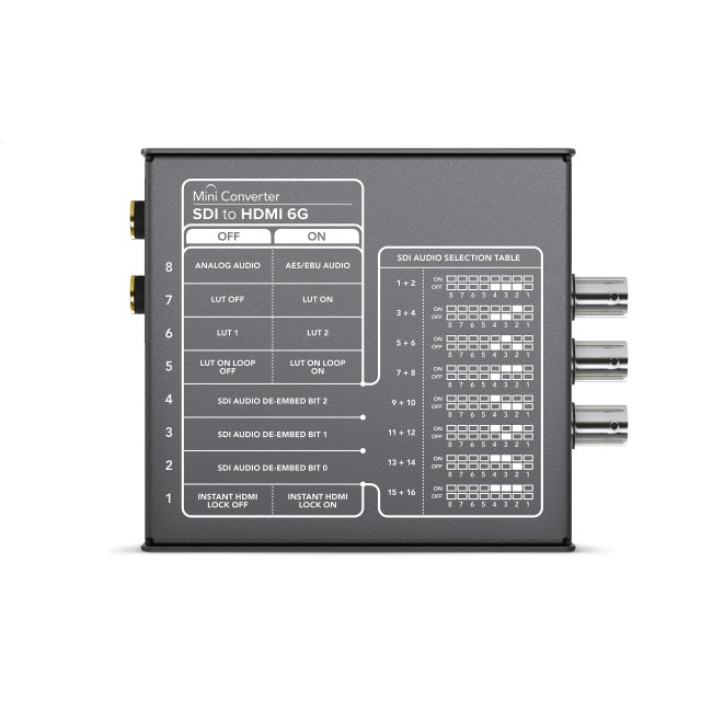 Model Mini Converter SDI na HDMI 6G ponuja tudi popolno podporo za 33-točkovne tabele 3D LUT za zelo natančno pretvorbo barv. Popravke LUT lahko uporabite na primer za predogled načrtovanih barvnih prilagoditev videoposnetka neposredno med snemanjem. Datoteke 3D LUT so združljive s programom DaVinci Resolve, zato lahko iste barvne popravke uporabite med produkcijo in postprodukcijo videomateriala. Podpora za zvok je prav tako obsežna: z modelom Mini Converter SDI na HDMI 6G je mogoče odstraniti zvok iz linije SDI v HDMI, z izdelkom HDMI na SDI 6G pa je mogoče v signale SDI vgraditi zvok iz HDMI, simetričnih analognih ali digitalnih zvočnih vhodov AES/EBU.