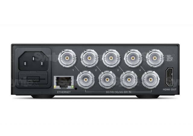 Blackmagic MultiView 4 je nov večpredstavnostni program za predogled štirih neodvisnih virov signala SDI na enem monitorju. Uporabniki lahko hkrati spremljajo katero koli kombinacijo formatov SD, HD in Ultra HD z različnimi frekvencami sličic. Izhodni signal je mogoče prikazati na običajnih monitorjih HD, pa tudi na novih monitorjih Ultra HD s štirikratno ločljivostjo! Daljinsko upravljanje prek omrežja Ethernet in programske opreme za operacijska sistema Windows ali Mac OS X. Prikazano v konfiguraciji z dodatno sprednjo ploščo Teranex Mini Smart Panel z upravljalnimi elementi in zaslonom (ni vključeno).