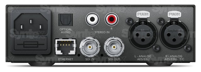 Izdelki Teranex Mini so opremljeni tudi s standardnimi priključki XLR za simetrične zvočne linije, digitalne vmesnike AES/EBU ali za priključitev virov časovne kode. Uporabniki lahko uporabljajo standardno studijsko ožičenje z zanesljivo vrsto konektorja, ki ima zaklep za preprečevanje nenamernega izvleka kabla. Zvočno vezje naprave Teranex Mini je bilo popolnoma na novo zasnovano za izjemno nizko raven šuma (več kot -115 dBFS) in najvišjo kakovost zvoka.