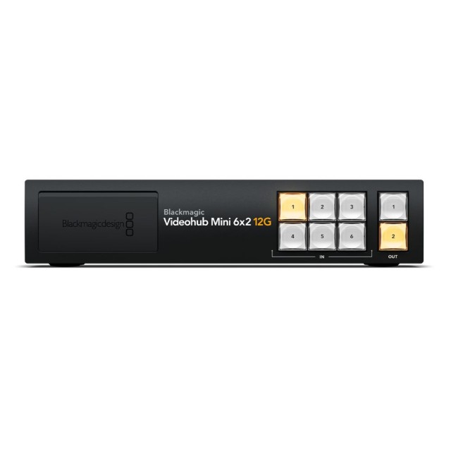 Ponuja 6 vhodov 12G-SDI in 2 izhoda 12G-SDI v izjemno majhnem ohišju širine 1/2 stojala. Za vsak vhod je na voljo izhod za zanko. Blackmagic Videohub Mini 6x2 12G je primeren za stranke, ki delajo v omejenih prostorih in želijo razširiti število vhodov na svoji opremi SDI. Poleg dodajanja dodatnih vhodov za oddajno opremo SDI vključuje Blackmagic Videohub Mini 6x2 12G tudi priključke 12G-SDI, ki delujejo v vseh video standardih SD, HD in Ultra HD do 2160p60, referenčni vhod in stikalo clean, ki se izbere na video izhodih. Tako lahko na primer določen vir preklopite na samo en izhod, medtem ko lahko isti vir hkrati usmerite kot neposredni izhod na druge izhode.
