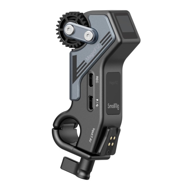 Motorček/sprejemnik SmallRig MagicFIZ za brezžično stransko ostrenje. Brezžični motorček (9 V/18 W, 0,5 Nm) podpira hitro polnjenje prek protokola USB PD/QC, napaja pa se lahko tudi prek baterijske plošče (3777) za baterijo NP-F ali prek baterije V-Mount, priključene z izbirnimi kabli USB-C - D-Tap (3266) ali USB-C - DC (3268). 15-milimetrska objemka omogoča konfiguracijo ploščadi za ročno in ramensko delovanje skupaj z opcijskim ročajem 3917. S kabli (3325, 2971 in 2970, odvisno od vrste fotoaparata) je mogoče priključiti tudi opcijski daljinski upravljalnik in ga uporabiti za zagon/zaustavitev snemanja. Pri uporabi kablov se zakasnitev zmanjša na približno 5 ms.