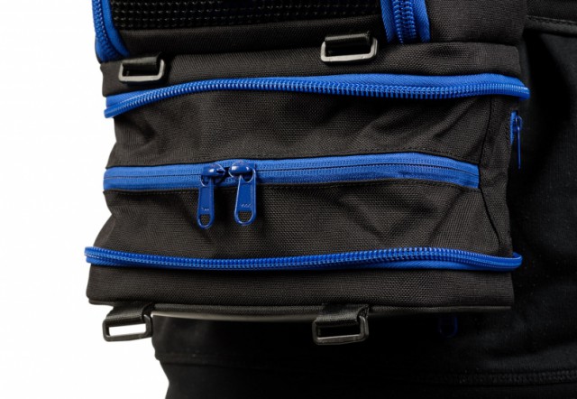Na dnu torbe je dodan poseben predal - ki ga je mogoče razširiti do 10 cm - za baterijo in/ali kable ter dodatno opremo. V zaprtem predelu z zadrgo boste našli vgrajeno prevleko za dež in prevleko, ki odbija sonce.