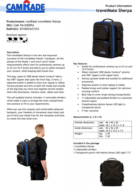 Nahrbtnik za fotoaparat travelMate Sherpa je naslednik priljubljenega nahrbtnika travelMate Handy 1. Ponuja dovolj prostora za varno prenašanje fotoaparatov dolžine do 43 cm, vzdržljiv material (Cordura®) in kakovostne zadrge (YKK®), ločen predal za tablični računalnik/prenosnik na sprednji strani ter seveda tudi notranje in zunanje žepe za prenašanje dokumentov, spominskih kartic, kablov itd.
