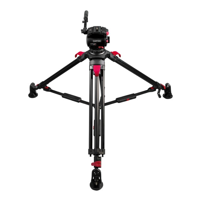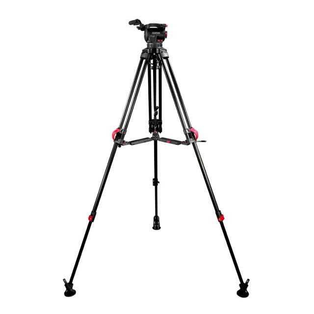 Sestava stativa, ki vključuje glavo Focus 10 Fluid Head, noge Red Lock Alu, sredinsko distančnik Smart Lock, gumijaste škornje in torbo za prenašanje.