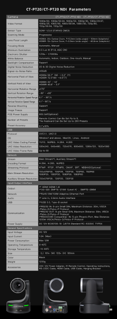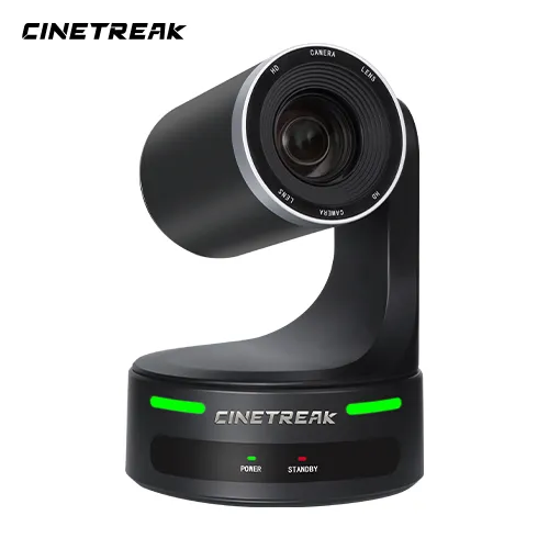 CineTreak CT-PT12 je visokozmogljiva kamera PTZ (pan-tilt-zoom), zasnovana za profesionalno pretakanje in zajemanje videoposnetkov. Opremljena je z 1/2,8-palčnim senzorjem HD CMOS in zagotavlja kristalno čiste videoposnetke 1080p60, ki so idealni za prenose v živo, spletne seminarje, predavanja in produkcijo v kulturnem domu. 12-kratna optična povečava in 16-kratna digitalna povečava zagotavljata podrobne bližnje posnetke tudi z razdalje, samodejno sledenje pa poskrbi, da je govornik v kadru osredotočen brez uporabe rok.