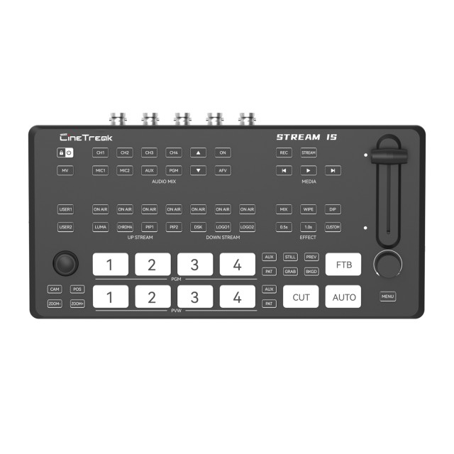 CineTreak Stream 1S je robustno profesionalno stikalo za živo predvajanje, zasnovano za zahteve večkamerne produkcije v živo. Ima 4 vhode SDI, 1 izhod PGM, 1 izhod PVW/AUX in 6 vhodnih kanalov, vključno z viri SDI, AUX, mediji v ozadju in down-stream, zato omogoča dinamično, večplastno preklapljanje v živo.