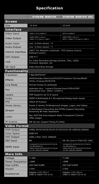 CineTreak Stream Master izboljša vaš produkcijski potek dela z vrhunskim 10-palčnim zaslonom na dotik visoke natančnosti in robustnim aluminijastim ohišjem z zaslonsko zasnovo za boljšo uporabnost. Zasnovan je za profesionalce, saj podpira 4 vhode HDMI (HDMI 1-2 podpirata 4K) ter možnosti PGM, PVW (AUX) in video navzdol.