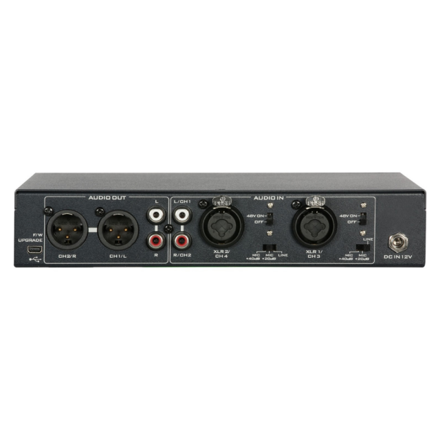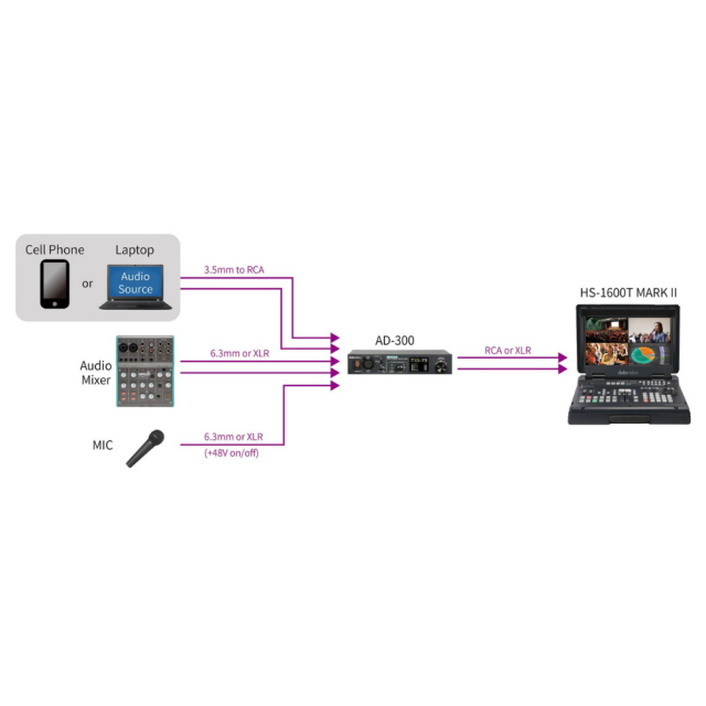 Datavideo AD-300 je profesionalna naprava za zakasnitev in učinke, ki ponuja vrsto integriranih funkcij za obdelavo zvoka ter sinhronizacijo zvoka in videa pri produkcijah v živo. Enota je opremljena s petimi vhodi (3x simetrični, 2x nesimetrični) in lahko izvaja zvočni zamik (do 3 s), mešanje, izenačevanje, visokoprepustne in nizkoprepustne filtre; zamik lahko nastavite neodvisno za vsakega od vhodov. Izenačevalnik ponuja osem frekvenčnih pasov (125 Hz - 16 kHz) z razponom ±10 dB. 2-palčni zaslon LCD na sprednji plošči omogoča enostavno nastavljanje parametrov funkcij, kot je razmerje kompresije za dinamične učinke (do 100 : 1). AD-300 izvaja tudi simetrično/nesimetrično pretvorbo zvoka in omogoča preklapljanje ravni med linijskim in mikrofonskim zvokom, vključno s podporo za fantomsko napajanje +48 V na vhodih XLR.