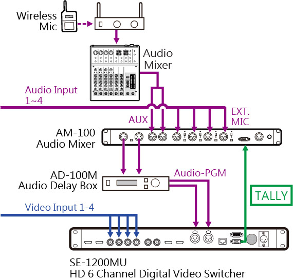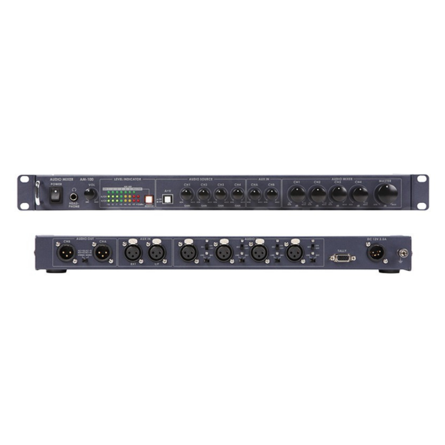 Datavideo AM-100 je 6-kanalni (4x mono in 1x stereo vhod) 19" avdio mešalnik z višino 1U. Podpira linijske ali mikrofonske vhode s fantomskim napajanjem, več mešalnikov AM-100 pa je mogoče verižno povezati prek kanala AUX.