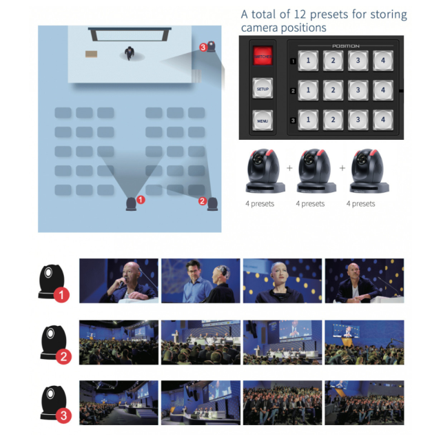 Vgrajene funkcije za nadzor kamer ShowCast 100 vam omogočajo hkratni nadzor treh kamer PTZ. Neposredno lahko shranite prednastavitve položaja objektiva, položaje obračanja in nagibanja v realnem času ter povečate in pomanjšate posnetek. Poleg tega lahko prilagodite ravnovesje beline, zaslonko in način zrcaljenja vsake kamere. Čeprav lahko ShowCast 100 upravlja le tri kamere PTZ, lahko shranite do štiri prednastavitve za vsako kamero, kar vam omogoča skupno 12 različnih zornih kotov za vašo produkcijo. 12 pomnilniških prednastavitev režiserju omogoča, da s pritiskom na ustrezne gumbe prednastavitev takoj preklopi med različnimi koti kamere v sistemu ShowCast 100. Na intuitivnem uporabniškem vmesniku z zaslonom na dotik lahko preprosto prilagodite nastavitve ostrenja, zaslonke in ravnovesja beline kamere. Nastavitve določenega programa lahko shranite v pomnilniške prednastavitve za prihodnjo uporabo.
