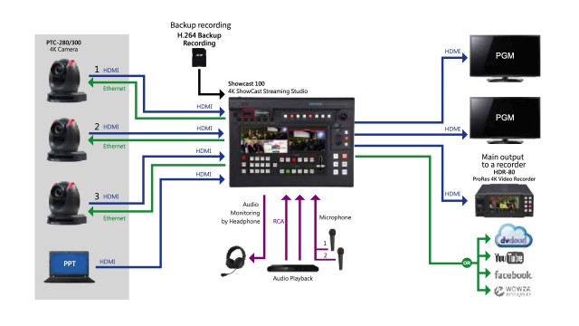 Vgrajeni dvojni kodirnik za prenos v živo vam omogoča hkratno snemanje in pretakanje. Z možnostjo snemanja v kameri ShowCast 100 lahko brez večjega napora preprosto ustvarite varnostno kopijo posnetih video datotek za naknadne produkcijske obdelave. Glede na pasovno širino lahko nastavite nizko, srednjo ali visoko bitno hitrost. Zaradi vse večjega povpraševanja po gledanju na mobilnih napravah lahko zdaj na napravi ShowCast 100 preprosto aktivirate portretni pogled, tako da preprosto pritisnete gumb Vertikalno, tako da bodo gledalci lahko gledali program na svojih mobilnih napravah, če jih bodo držali pokonci, ne da bi jim bilo treba spremeniti usmerjenost. Istočasno lahko oddajate na dve platformi za prenos v živo, kot so Facebook, Youtube in Twitch. Z dodatnim programom Datavideo dvCloud lahko hkrati prenašate na 25 platform za pretakanje v živo in samodejno varnostno kopirate svoje video datoteke v strežniku v oblaku.