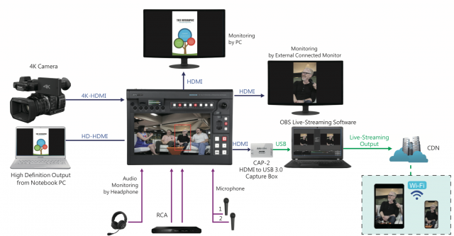 Izhod HDMI z zanko omogoča direktorjem produkcije neposredno spremljanje predstavitvenega vhoda. Vsi vhodi HDMI imajo vgrajene razbremenilne palice, ki zagotavljajo, da med produkcijo ni ničesar prepuščeno naključju, saj zmanjšujejo možnost, da bi se kabli odklopili