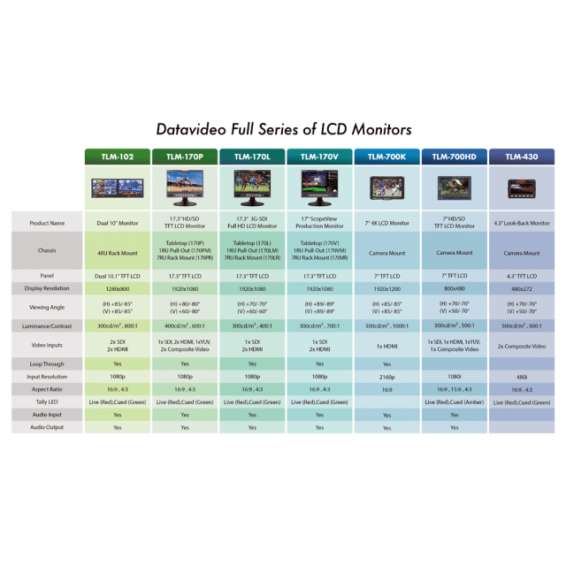 Monitor Datavideo TLM-170L je zasnovan za vrhunsko delovanje. TLM-170L vam bo pomagal samozavestno spremljati slike v izbranem delovnem procesu, ne glede na to, ali gre za uporabo v galeriji žive produkcije, spremljanje v 19'' stojalu, v vozilu OB Van ali v kompletu za urejanje videa. Če želite s to opremo pridobiti več vrednosti, si vzemite nekaj minut in temeljito preberite ta priročnik
