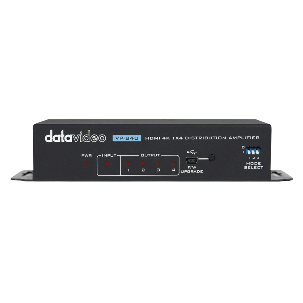 Datavideo VP-840 je distribucijski ojačevalnik 1x4 HDMI z možnostjo ponovnega prenosa vira HDMI na 4 zaslone hkrati. VP-840 podpira bitno hitrost do 18 Gpbs in ločljivost 4K2K@60Hz ter je združljiv s HDMI 2.0 in HDCP 2.2. VP-840 ima upravljanje EDID s samodejnim zmanjševanjem ločljivosti, kar zagotavlja več možnosti EDID za različne izhodne ločljivosti med vsemi napravami in zagotavlja pravilen prikaz vsebine vira HDMI na monitorjih.