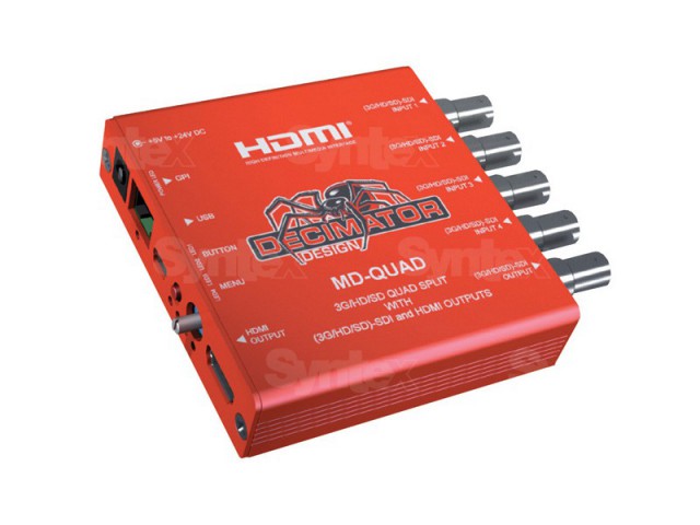 (3G/HD/SD)-SDI Quad Split z izhodi (3G/HD/SD)-SDI in HDMI. MD-QUAD podjetja Decimator Design je poceni miniaturni četverni razdelilnik 3G/HD/SD-SDI 4 proti 1 ali multiplekser s 4 proti 1 vhodom in povezanimi izhodi (3G/HD/SD)-SDI in HDMI.