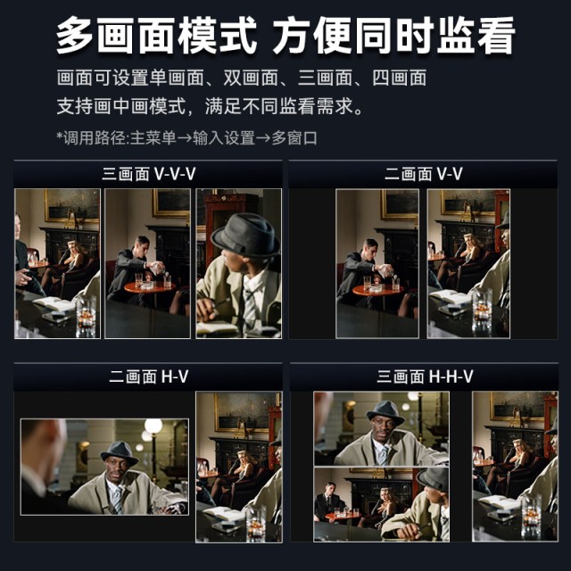 Način z več zasloni Zaslon lahko nastavite na enojni zaslon, dvojni zaslon, trojni zaslon ali četverni zaslon. podpira način slika v sliki za izpolnjevanje različnih potreb po spremljanju.