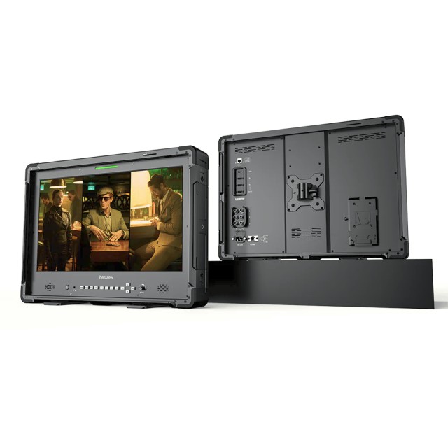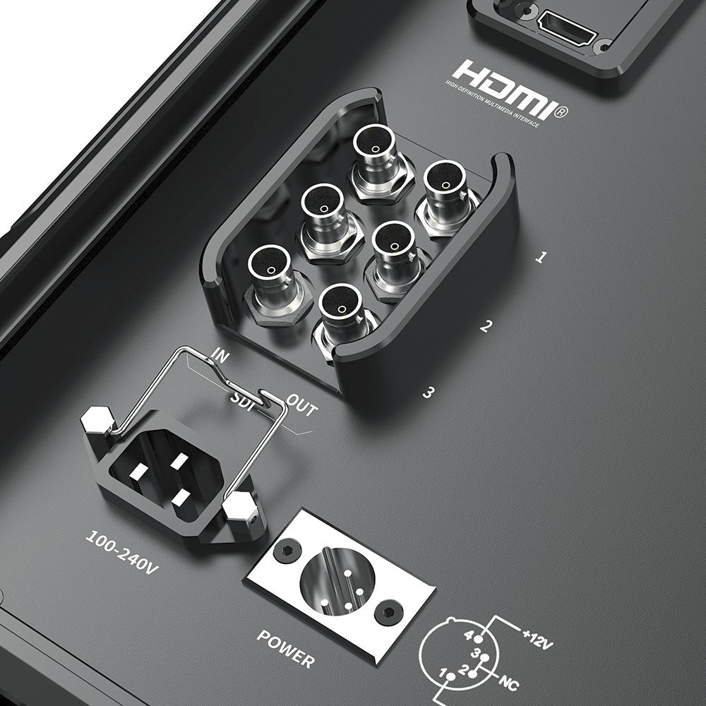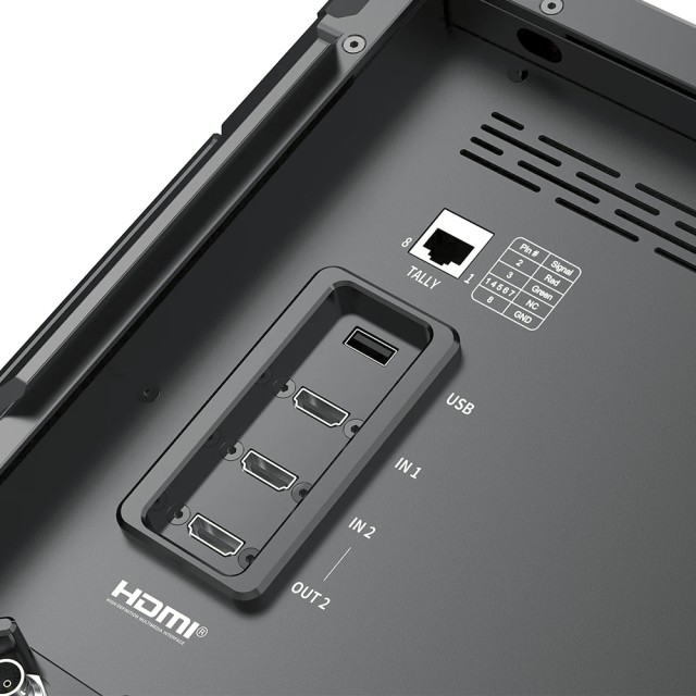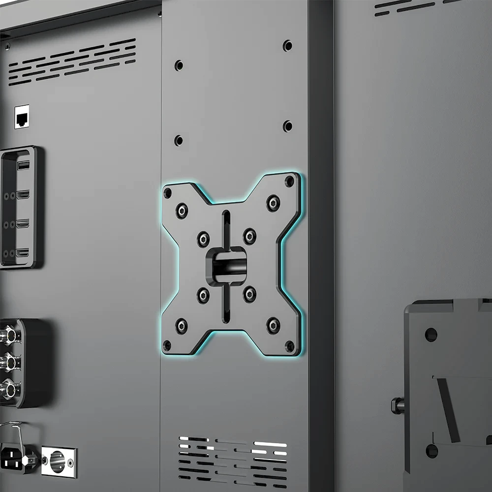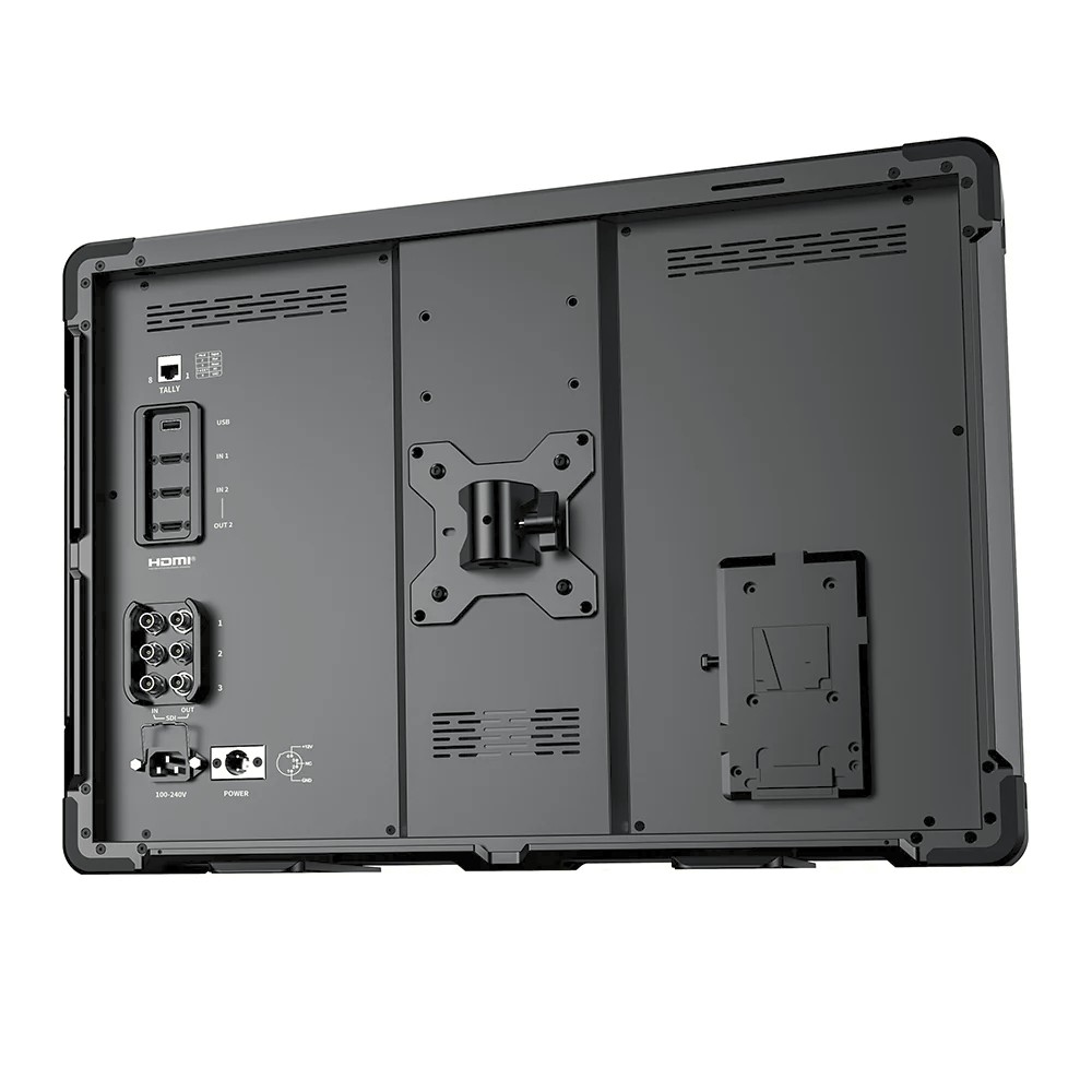 D21 Pro je zasnovan za zahtevna okolja in ima tlačno odporno kompozitno ohišje, ki lahko prenese do 80 kg obremenitve, okrepljeno z vojaškimi protinapadnimi zaščitnimi vogali, testiranimi za padce z višine 1,5 metra. Več 1/4"-20 in 3/8" pritrdilnih točk ter združljivost z VESA-pritrditvijo omogočajo nemoteno integracijo s stojali za luči, vozički in studijskimi napravami. Fleksibilnost napajanja je zagotovljena z napajanjem iz omrežja, XLR DC vhodom ali podporo za V-mount baterije, kar omogoča prilagodljivost studijskim, zunanjim ali mobilnim scenarijem snemanja. Trikolorna kontrolna lučka (rdeča/zelena/modra) na sprednji strani dodatno izboljša primernost za produkcijo v živo in okolja oddajanja.