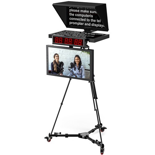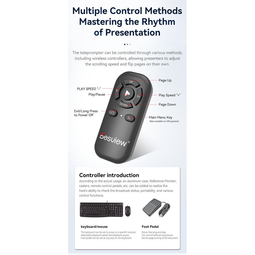 Teleprompter vključuje profesionalno programsko opremo za podajanje besedila s šifrirnim ključem, ki zagotavlja varno in stabilno delovanje v sistemih Windows. Bluetooth brezžični daljinski upravljalnik in žični pedali omogočajo več možnosti upravljanja, kar predstaviteljem ali operaterjem omogoča nemoteno prilagajanje hitrosti pomikanja in predvajanja. Celoten sistem je zasnovan za mobilnost in je shranjen v trpežni aluminijasti kovčki na kolesih, kar omogoča enostaven in varen prevoz med studii in lokacijami.
