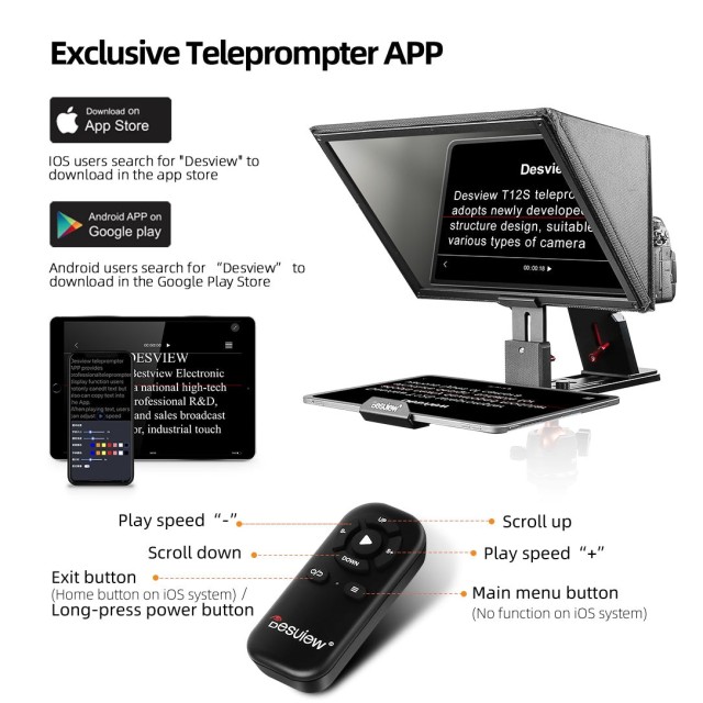 Profesionalni teleprompter Desview T12S, kataloška številka des-T12S, vam omogoča nemoteno branje scenarija med snemanjem videov ali predstavitvami. Ta zmogljiv teleprompter je idealen za vlogerje, ustvarjalce vsebin, profesionalne predstavitelje in poslovne namene. Desview T12S je enostaven za uporabo in zelo zanesljiv, pomaga vam doseči profesionalne rezultate in poveča vašo samozavest pred kamero. Odkrijte nov standard za branje besedila med snemanjem.