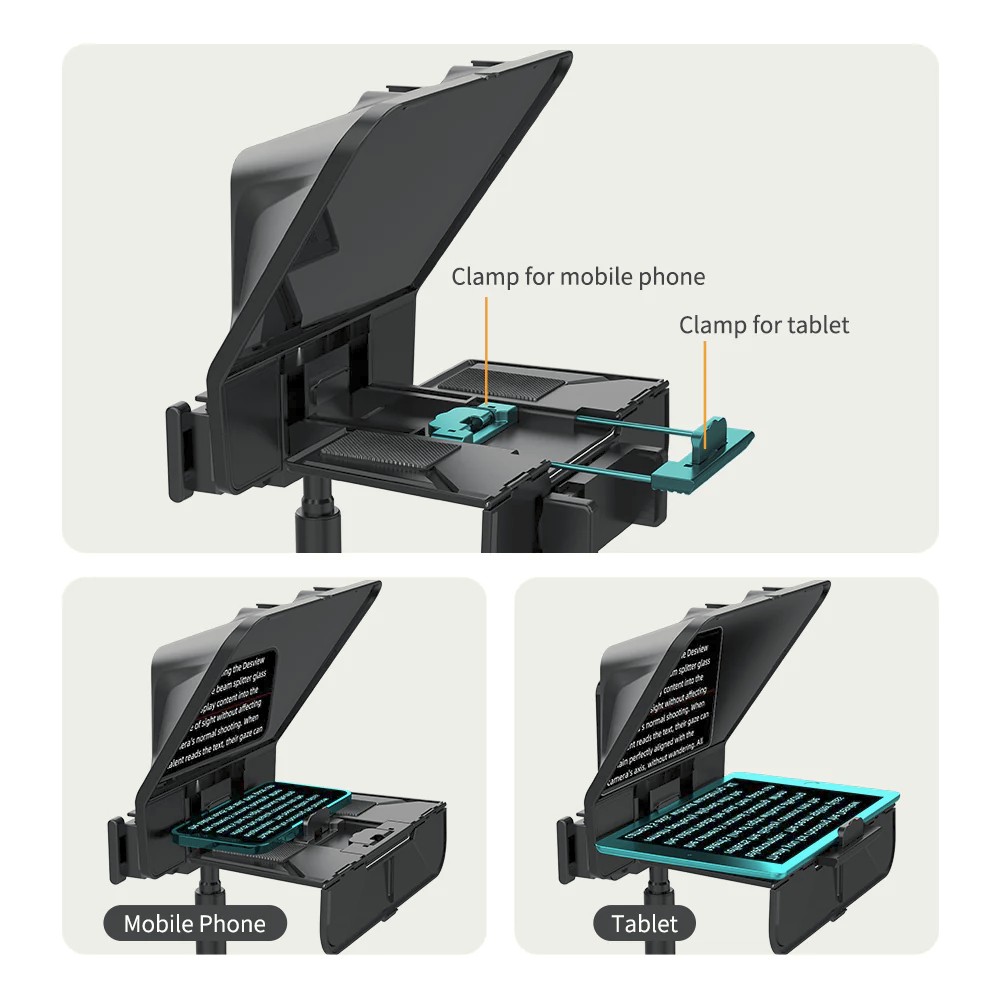 Prenosni teleprompter Desview T5 združuje strokovno znanje s področja profesionalnega oddajanja z inovativnim zasnovanim sodelovanjem z dvojnim zaslonom, ki izboljšuje neposredno predvajanje in ustvarjanje vsebin. Glavni zaslon prikazuje vsebino scenarija v visoki ločljivosti, medtem ko sekundarna samonadzorna nastavitev ustvarjalcem omogoča, da v realnem času spremljajo komentarje v živo ali stanje snemanja, kar zagotavlja tekoče predvajanje in pristno vključevanje občinstva. Profesionalno steklo za delitev žarka zagotavlja jasen, berljiv tekst s 70 % prepustnostjo svetlobe in 30 % odbojnostjo, kar zagotavlja, da ni vpliva na kakovost slike. T5 podpira tako navpično kot vodoravno snemanje in je združljiv s pametnimi telefoni, tablicami do 11 palcev in kamerami, ki uporabljajo prilagodljive obroče 49–82 mm. Enostavna namestitev s pritrditvijo omogoča hitro in intuitivno nastavitev, raztegljiva sponka pa podpira do 19 cm obsega pritrditve. Bluetooth daljinski upravljalnik in aplikacija Desview Teleprompter omogočata brezžično upravljanje pomikanja, hitrosti in velikosti pisave. Z dvojnim nosilcem za vročo stopalko, univerzalnim vijakom 1/4" in senčnikom za svetlobo je Desview T5 vsestranska rešitev za teleprompter za spletne tečaje, prodajo v živo, intervjuje in produkcijo VLOG.