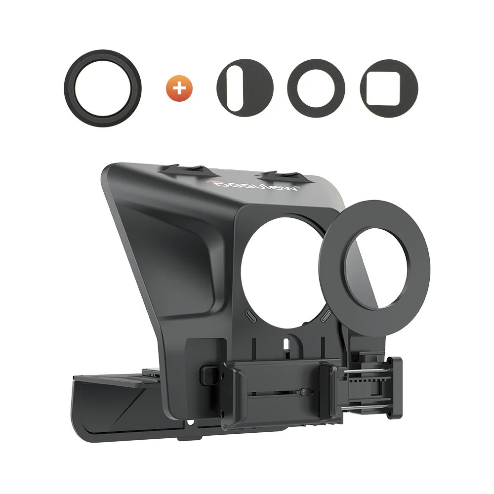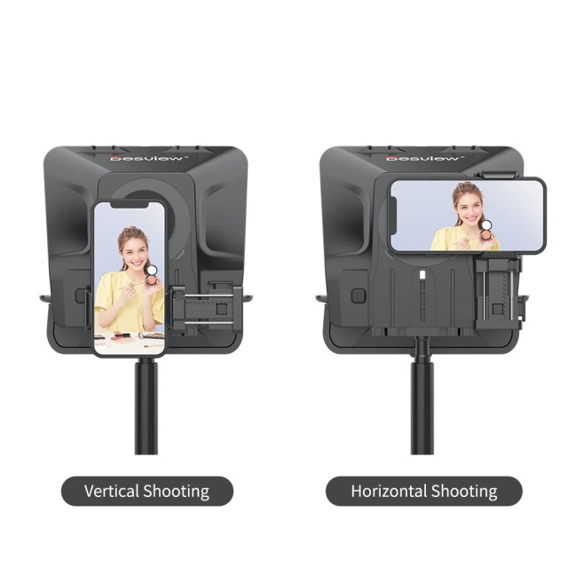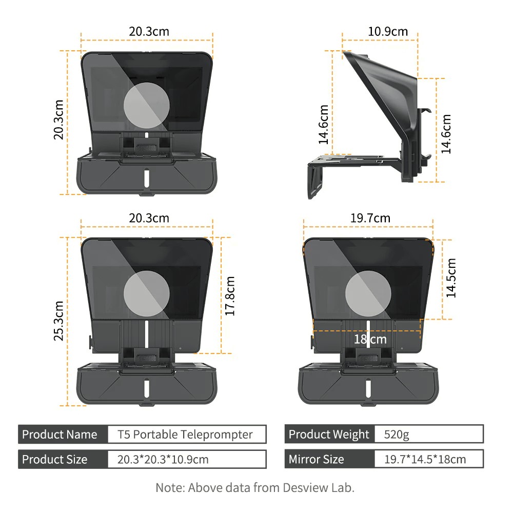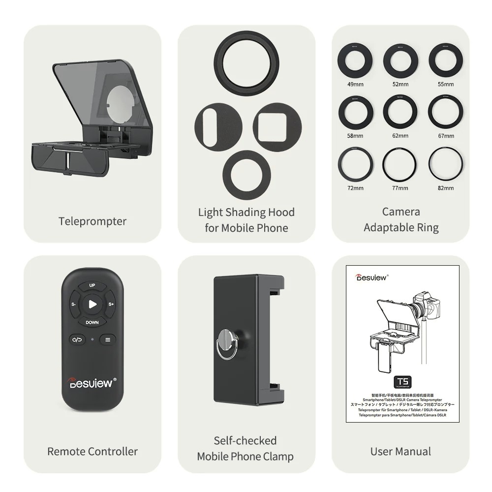 Desview T5 je inovativen prenosni teleprompter z dvojnim zaslonom, zasnovan za naraven očesni stik in samozavestno predstavitev med neposrednim prenosom, vloganjem, spletnimi tečaji in intervjuji. Opremljen je s steklom za delitev žarka, primernim za televizijsko oddajanje, daljinskim upravljalnikom Bluetooth in široko združljivostjo z napravami, kar omogoča gladke in profesionalne predstavitve.
