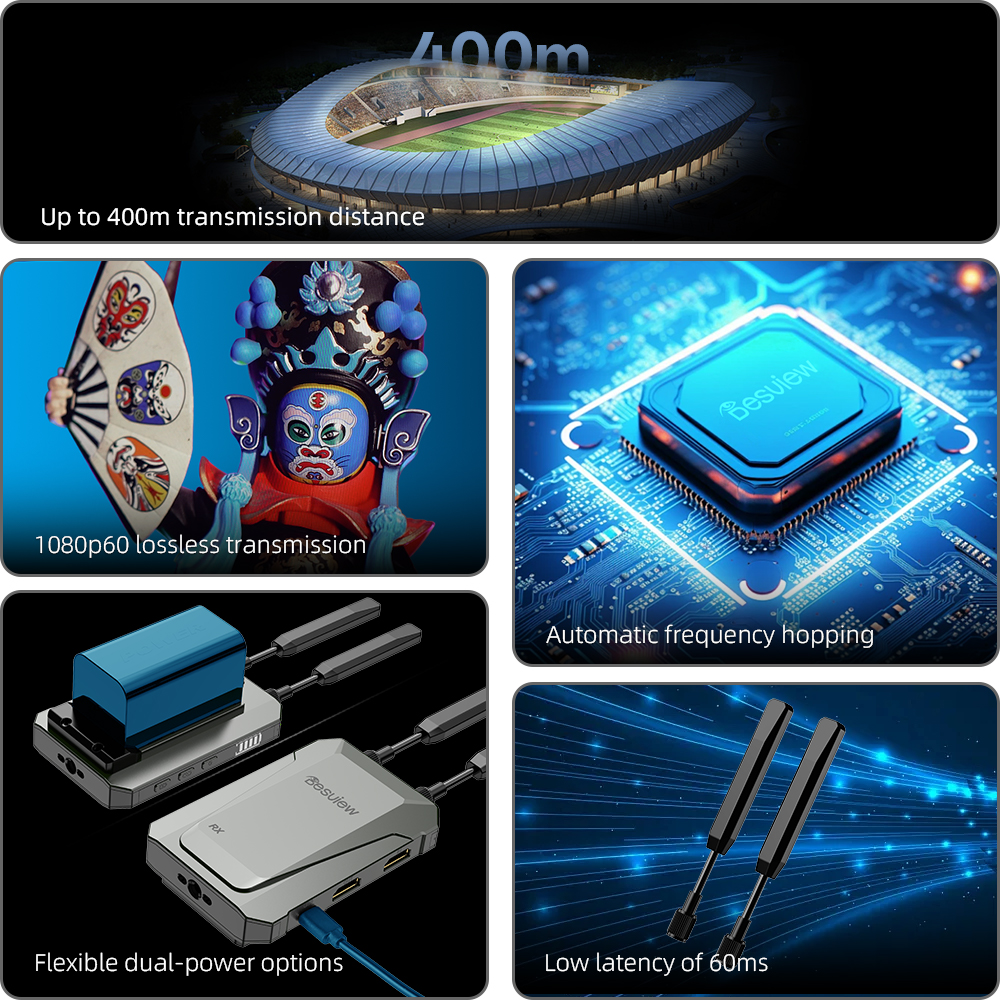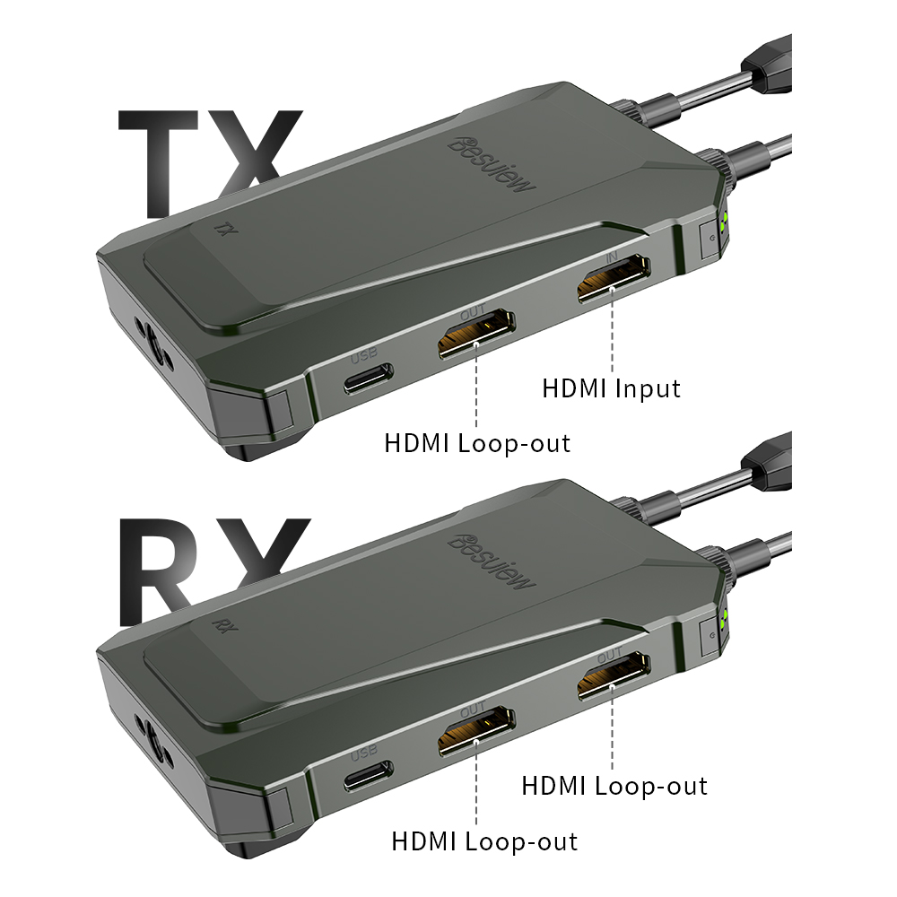 Vse-v-enem vmesniki, hitra nastavitev Plug-and-Play vhod signala:oddajnik ima HDMI vhod in HDMI izhod, kar vam omogoča enostavno priključitev kamere ali brezzrcalne kamere in lokalno spremljanje za enostavno kadriranje.