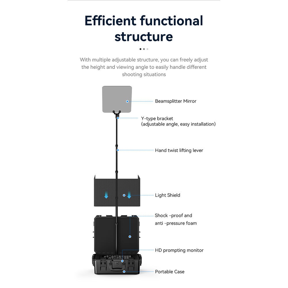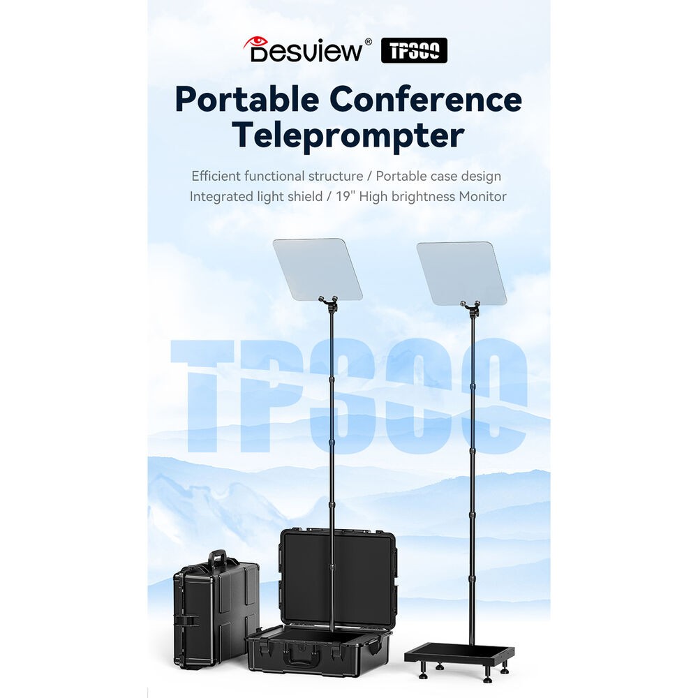 Prenosni teleprompter Desview TP300 je profesionalna rešitev za govorce, ki potrebujejo samozavestno in tekoče govorjenje med konferencami, predavanji, poslovnimi dogodki in javnimi govori. Opremljen je z 19-palčnim monitorjem z visoko svetilnostjo (1000 cd/m²) in 22-palčnim večplastno prevlečenim odbojnim zrcalnim steklom, ki omogoča jasno pomikanje besedila, hkrati pa ostaja nevidno za občinstvo.